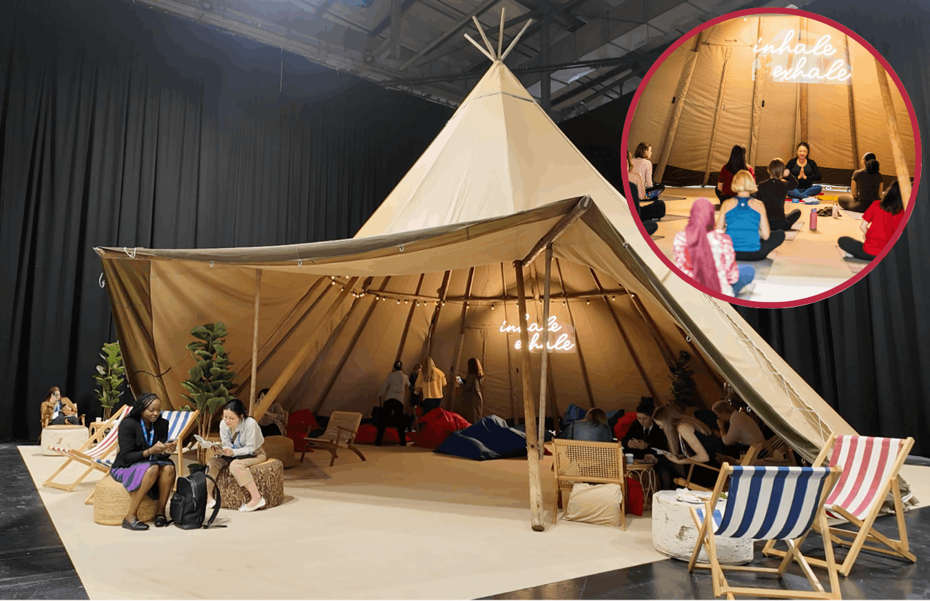 The exhibition area is more than just a space for our stands; it serves as the primary hub for networking, poster presentations, lunches, and tea and coffee, with the BSH stand centrally located. This hall was a blank canvas, ready to be transformed into a vibrant networking centre. The challenge, however, was how to make it genuinely engaging. Each year, BSH integrates wellness into its programme, including guided yoga sessions to start the morning. With this in mind, we aimed to create a welcoming environment where delegates could disconnect from the main sessions and fully immerse themselves. With this in mind, we designed a wellness teepee within the exhibition hall, providing comfortable seating throughout the day, which was then reconfigured with yoga mats for the morning sessions. Once the conference concluded, the yoga mats were donated to "The Wee Retreat". A community space located in Glasgow with a focus on prioritising physical, emotional, and mental wellbeing through self-care.